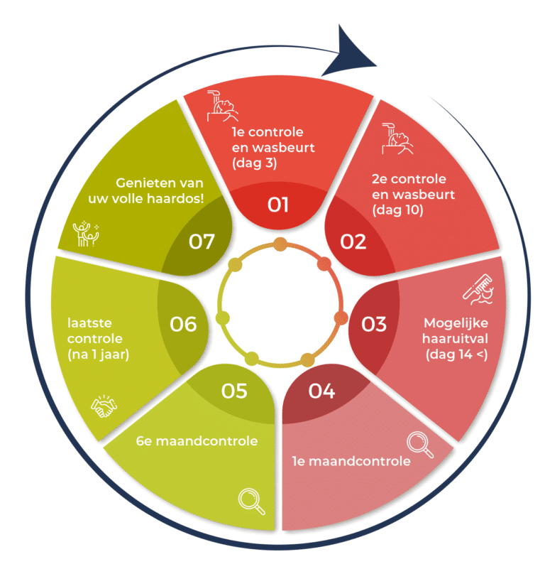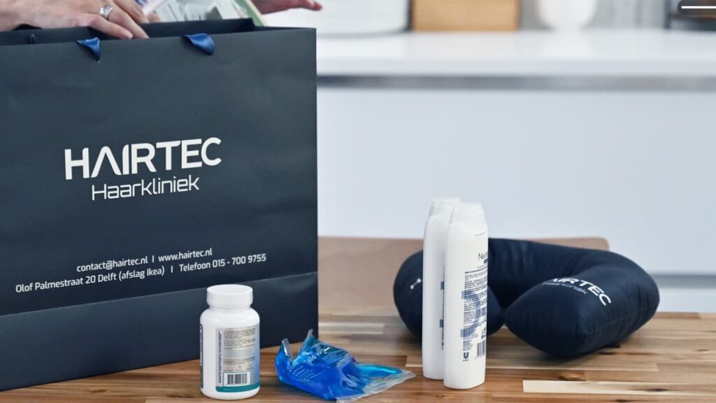 U krijgt een nazorgpakket mee met lotion en shampoo. Deze producten zijn speciaal ontwikkeld voor een gevoelige, herstellende hoofdhuid. Gebruik ze zoals voorgeschreven en vermijd andere shampoos of stylingproducten in de eerste weken.